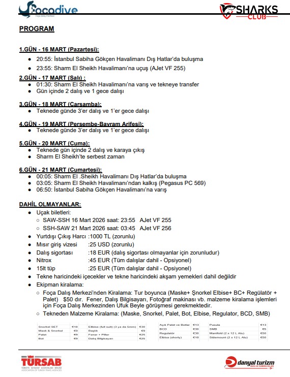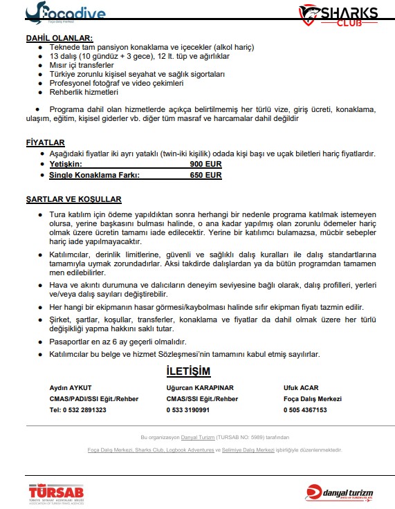 ● Dalış sigortası :18 EUR (dalış sigortası olmayanlar için zorunludur)